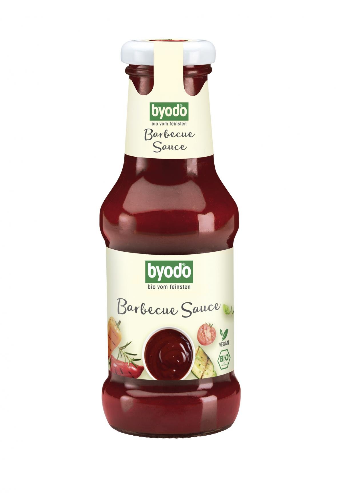 Feines Rauchsalz gibt der würzigen Barbecue Sauce von Byodo den typischen Geschmack. Die vegane Feinkostsauce ist frei von Hefe und Gluten.