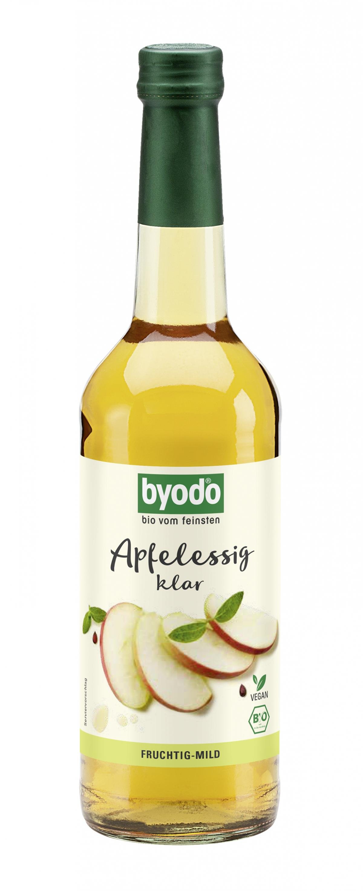 Für den klaren Byodo Apfelessig (5% Säure) werden nur feine Bio-Äpfel verwendet. Diese werden gemostet und der Apfelmost anschließend bei warmen Temperaturen zu Essig vergoren. Man spricht dabei von einer kontinuierlichen Essigvergärung. Für seine strahlend gold-gelbe Farbe wird dieser Bio-Apfelessig anschließend nur noch gefiltert. Er hat einen wunderbar frisch-fruchtigen Geschmack und passt damit z.B. herrlich zu Chutneys und zu kräftigen Salaten.