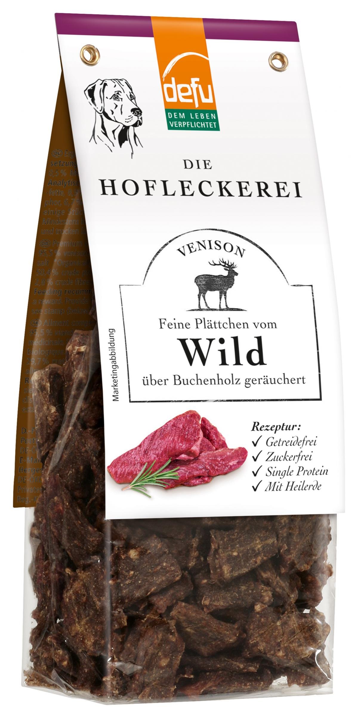 Feine Plättchen vom Wild über Buchenholz geräuchert Mit 95,5 % Hirsch- und Rehfleisch aus Wildbestand Verfeinert mit Heilerde Getreidefrei Single Protein Ohne Zucker oder Konservierungsmittel Erhältlich in den Größen 125 g und 8 x 125 g
