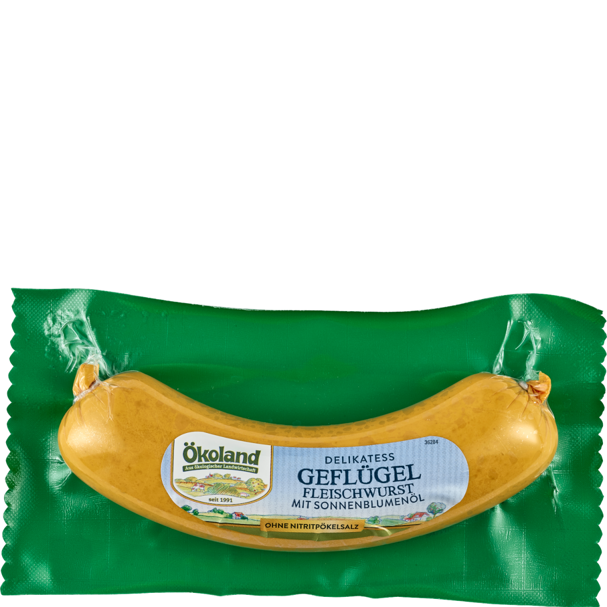 Die Ökoland Geflügel-Fleischwurst wird aus bestem Bio-Puten- und -Hähnchenfleisch hergestellt. Das Ergebnis ist ein Produkt von höchster Qualität, die Sie schmecken können. Dank einer ausgefeilten Rezeptur unter Verwendung von Sonnenblumenöl und einem hohen Fleischanteil schmeckt sie so ausgezeichnet. Geeignet für den kalten Verzehr, zum Erhitzen und Braten.