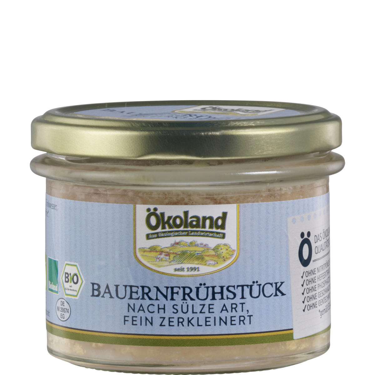 Das Ökoland Bauernfrühstück ist eine besondere und magere Wurst-Spezialität aus hochwertigem, reinen Bio-Schweinefleisch. Die grobere, fleischige Struktur und die ausgewählten Gewürze sorgen für den guten und herzhaften Geschmack. Die Wurst ist schnittfest mit leichter Jusbildung, dadurch besonders saftig. Im praktischen Zylinderglas leicht entnehmbar.