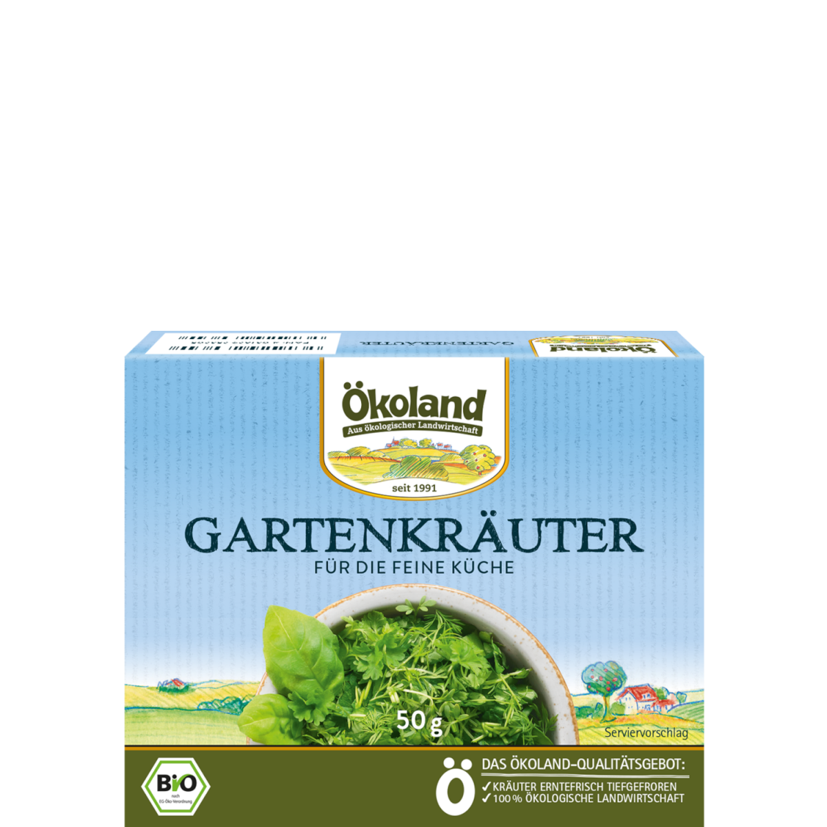 Die Ökoland Garten-Kräuter präsentieren sich als Bio-Kräuterkomposition aus 6 beliebten Küchenkräutern wie Kresse, Schnittlauch, Sauerampfer, Basilikum, Dill und Petersilie. Sie werden sorgfältig nach strengen Bio-Richtlinien angebaut und erntefrisch tiefgefroren. Fein gehackt, streufähig, in der praktischen wiederverschließbaren Faltschachtel sind sie unverzichtbare Helfer in jeder Küche.