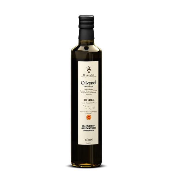 Stickstoff ist kein Sauerstoff in der Flasche und der Oxidation wird vorgebeugt. Die hervorragende Qualität sowie der grasige Duft und grünfruchtige Geschmack bleiben bewahrt. Mit dem Namen Iphigenia für das Olivenöl ehrte die Familie Vardakis einen Neuankömmling in ihren Reihen mit eben diesem Namen. QUALITÄTSANALYSE (Auszug) vom 22.12.2022:  Anteil freier Fettsäuren: 0,28 % / Peroxidzahl: 6,6 meq O2/kg / Wachse: 34 mg/kg / K232: 1,886 / K268: 0,132 / DeltaK: -0,004 / Polyphenole (total): 685 mg/kg. Erzeuger-, jahrgangs- und sortenreine Abfüllung. Ernte November/Dezember 2022