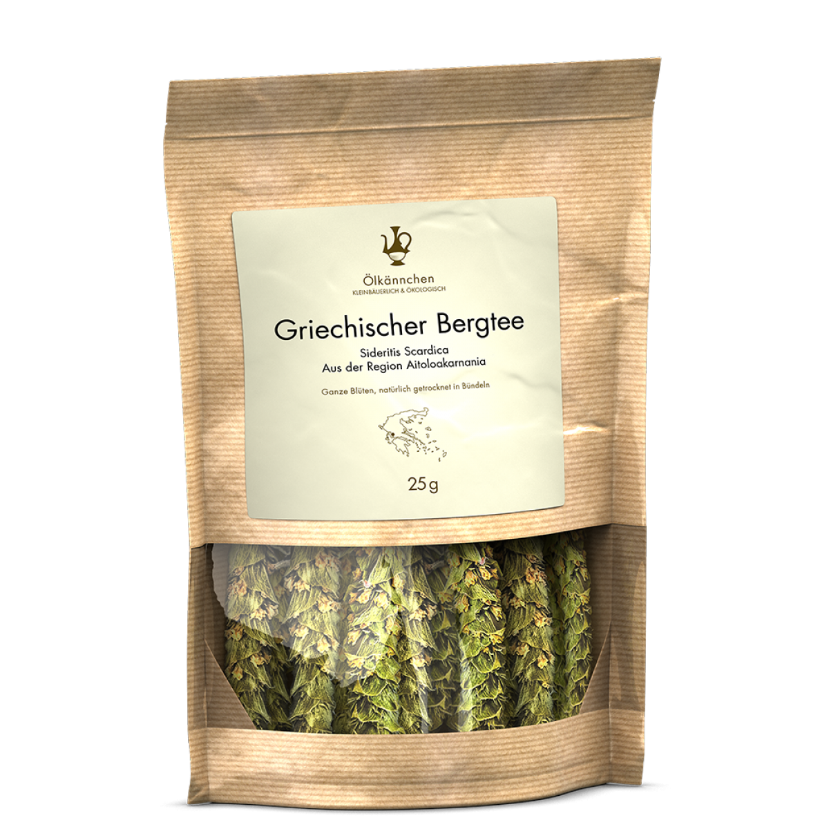 Ölkännchen Griechischer Bergtee Sideritis scardica: Die Felder der Familie Gkolezakis befinden sich in der Region Aitoloakarnania auf einer Höhe von 450 bis 500m. Auf vier Hektar wird vor allem Bergtee der Sorte Sideritis scardica angebaut. Die Ernte erfolgt von Hand und die Trocknung in Bündeln natürlich ohne Wärmezufuhr. Der Tee ist daher besonders aromatisch und schmeckt süßlich-fruchtig mit Zitronennoten, ein wenig an süßen Salbei erinnernd. Die Blüten und Stängel mit kochendem  Wasser aufgießen und vier bis fünf Minuten ziehen lassen. Ein bis zwei Dolden je große Tasse ergeben einen sehr frisch und blumig schmeckenden Tee.