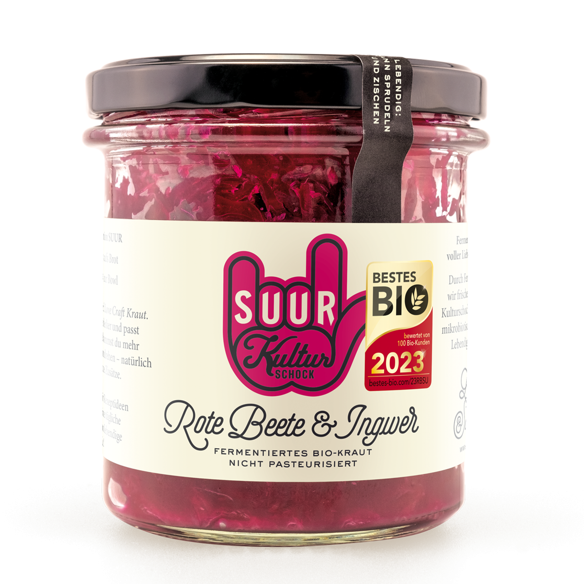 Super-aromatisch und in knalligem Pink ein echter Eyecatcher auf dem Teller. In diesem Kraut wird faserstoff- und vitaminreicher Weißkohl zusammen mit frischer Roter Beete fermentiert. Diese liefert dir neben viel Vitaminen auch Eisen und jede Menge Antioxidantien. Sie wirkt blutbildend und blutdrucksenkend und hilft dank Betain auch Leber und Verdauung auf die Sprünge. Ingwer fördert die Durchblutung und wirkt entzündungshemmend.