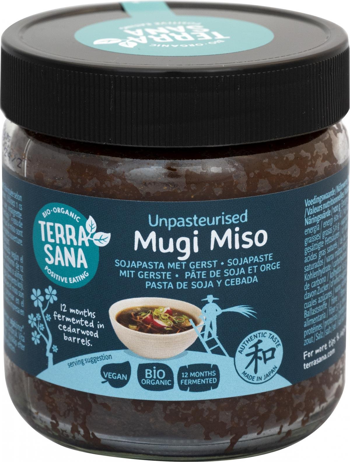 Mugi Miso wird aus biologischen Sojabohnen und Gerste hergestellt. Dieses Miso ist eine perfekte Mischung aller fünf Geschmäcker: Salzig, Süß, Bitter, Sauer und Umami. Mugi Miso wird auf handwerkliche Art hergestellt und fermentiert mindestens 12 Monate lang in 100 Jahre alten Zedernholzfässern. Diese Zeit ist erforderlich, um den Geschmack zu intensivieren und gesundheitlich wertvolle Eigenschaften entstehen zu lassen. Das Ergebnis ist ein authentisch schmeckendes japanisches Würzmittel, das vom Geschmack her zwischen Hatcho und Shiro Miso liegt. Mugi Miso ist auch sehr lecker in einer (Miso-)Suppe, macht sich aber auch gut zu Nudel-, Gemüse- und Tofugerichten. Mugi Miso ist vom Geschmack her mittelkräftig und etwas salziger als Genmai Miso. Auch pasteurisiert erhältlich, in einem Beutel mit Schraubverschluss. Willst du einmal mit eigenen Augen sehen, wie unsere Mugi Miso in Japan hergestellt wird?Sieh dir dieses Video an.