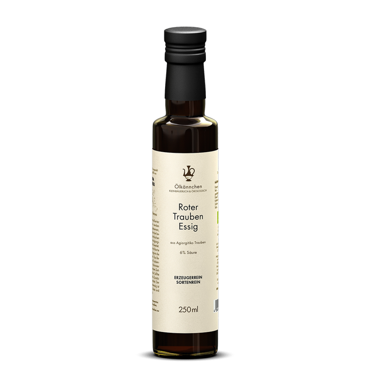Roter Bio Traubenessig, fruchtig und frisch. In der berühmten Anbauregion Nemea im Nordwesten der Peloponnes haben sich Nikos & Costas von Sofia Tis Fisis auf die Produktion von Traubenessigen aus den lokalen Sorten Roditis (weiß) und Agiorgitiko (rot) spezialisiert. Unter kontrollierter Temperatur werden die handgelesenen, reifen Trauben der berühmten griechischen Rotweinsorte Agiorgitiko zu Wein bereitet. Durch kontrollierte Luftzufuhr beginnt die Fermentation. Das Resultat ist ein Traubenessig mit rubinroter Farbe und fruchtig frischem Aroma. Es werden zu keinem Zeitpunkt Sulfite oder andere Zusatzstoffe verwendet. Sorten- und erzeugerrein.