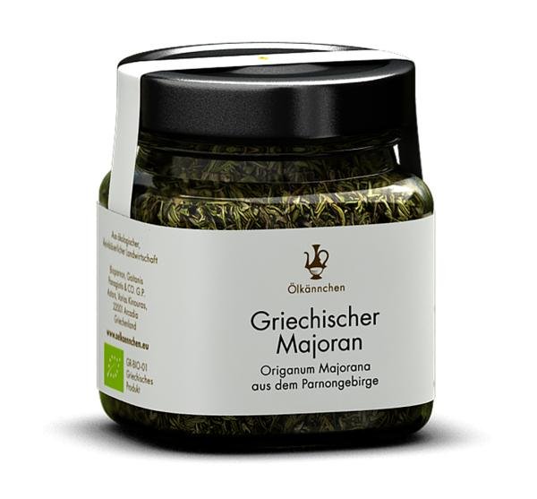 Ölkännchen Griechischer Bio Majoran (Origanum majorana) wird von Bio Parnon, bestehend aus den drei Partnern Takis, Georgios und Ilias, auf ca. 1000m Höhe in der weitestgehend unberührten Natur des Parnongebirges angebaut. Der Majoran wird von Hand gelesen und die Trocknung erfolgt langsam und ohne maschinelle Wärmezufuhr, weshalb er sehr aromatisch ist. Passt zu Eintöpfen, Fleischgerichten und  Mediterranem. Erwärmen Sie die Kräuter in Olivenöl, um die Aromen zu binden!