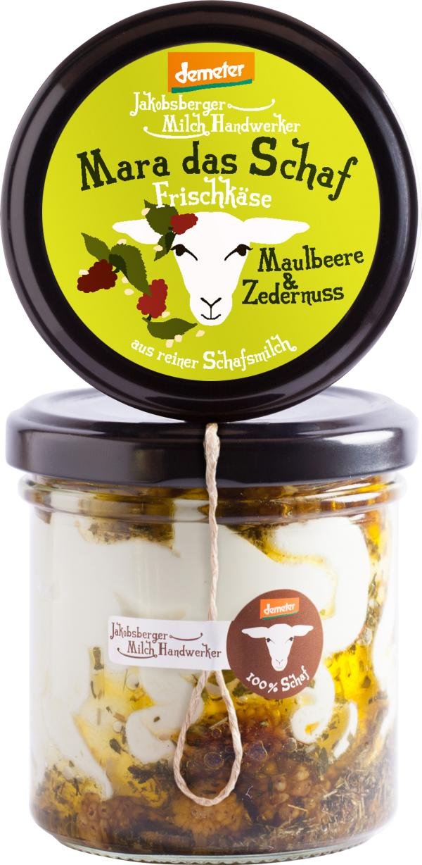 Mara Maulbeere & Zedernuss ist eine süße Kräutervariation unserer Frischkäse. Durch die Süße der Maulbeeren, das Knacken der Zedernuss, abgerundet mit der herben Note des Olivenöls ergibt sich ein frischer, ungewöhnlicher Käse