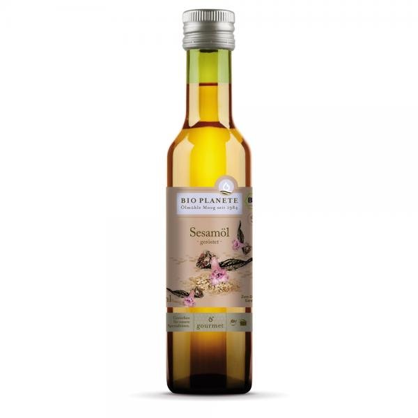 Sesamöl geröstet - reich an mehrfach ungesättigten Fettsäuren. Geröstetes Bio-Öl ideal für die makrobiotische Küche.