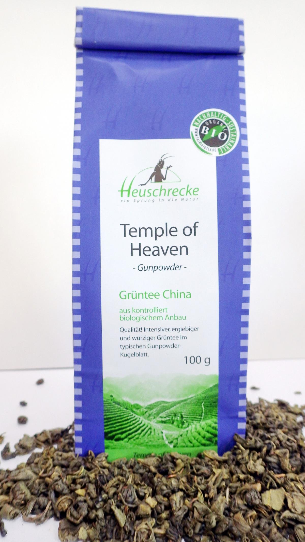 Fein gerollter, herber chinesischer Grüntee. Helle Optik, milde, duftige Tasse. Pin Head "Edler Gunpowder" mit typischem Kugelblatt. Teefarm Feiyue, Provinz Hunan
