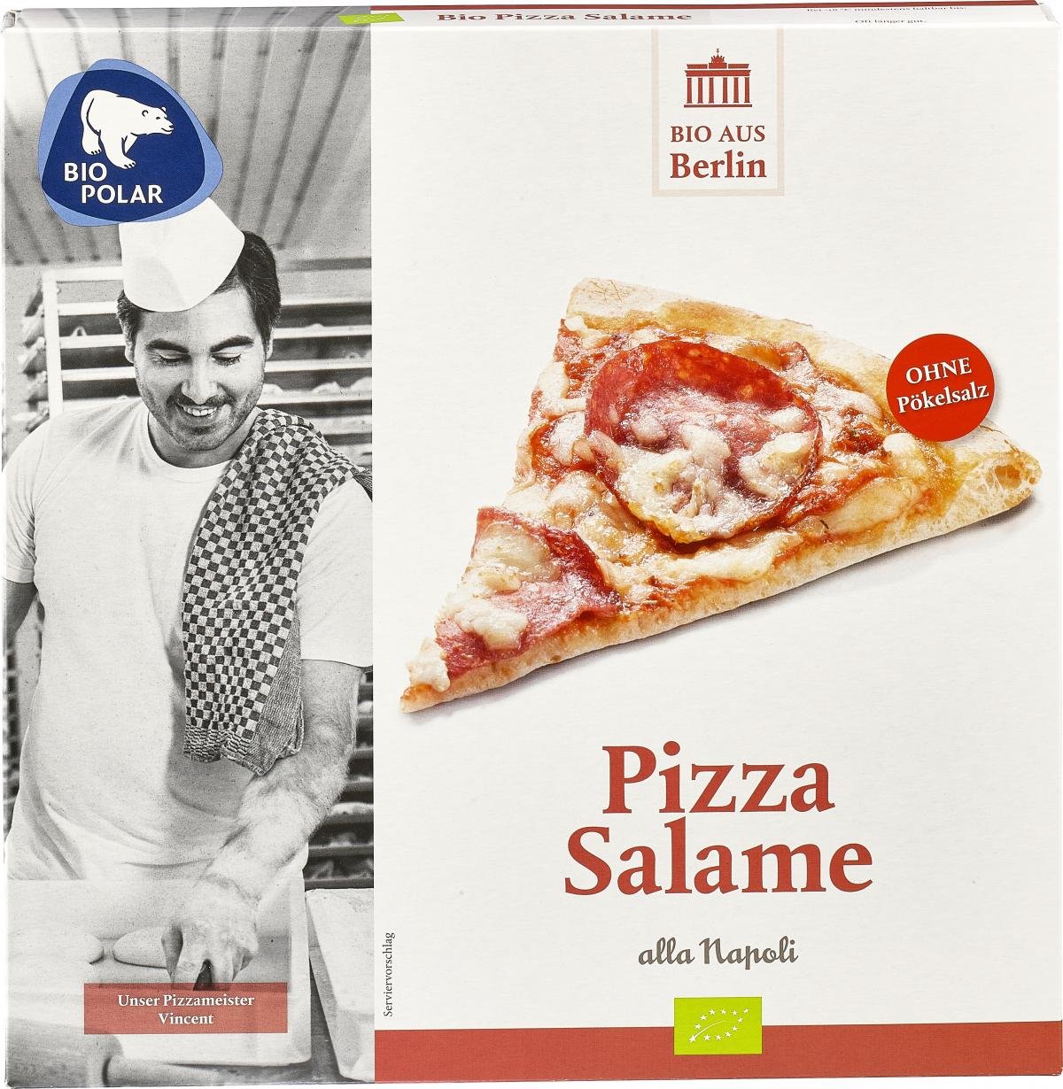 Teig* (WEIZENMEHL*, Wasser, Hefevorteig* [WEIZENMEHL*, Wasser, Hefe*], Meersalz, natives Olivenöl extra*, Hefe*), passierte Tomaten* 21 %, MOZZARELLA* 11,5 %, Salami* 7 % (Schweinefleisch*, Schweinespeck*, Salz, Pfeffer*, Knoblauch*, Koriander*, Muskat*, Bockshornklee*, Pastinake*, Liebstock*, Pfefferextrakt*, färbendes Lebensmittel: Rote Beete Pulver*, Antioxidationsmittel [Rosmarinextrakt*], Dextrose*, Reifekulturen, Buchenholzrauch), Wasser, Meersalz, natives Olivenöl extra*