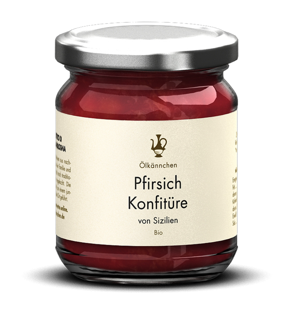 Ölkännchen Bio Pfirsich Konfitüre von Sizilien mit 85% Fruchtanteil. Die sonnenverwöhnten Pfirsiche stammen aus eigenem, nachhaltigen Anbau der Familie Bologna und werden reif geerntet und erntefrisch eingekocht. Die handwerkliche Verarbeitung der köstlich fruchtigen Konfitüre erfolgt nach Großmutters traditionellem Rezept. Il Frutteto wird von einem jungen Team, überwiegend Frauen des Ortes geführt.