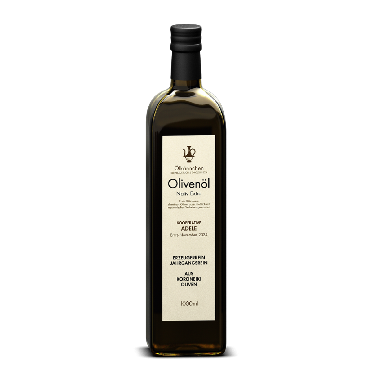 Mittelfruchtiges, leicht herbes Bio Koroneiki Olivenöl erster Güteklasse von der Kooperative aus Adele auf Kreta. Die Kooperative des Dorfes Adele im Distrikt Rethymno ist eine private Initiative von Kleinbauern im Ort.Stelios Kaliouris, Sprachrohr und Vorstand der Kooperative, hat im griechischen Olivenölpanel verkostet und organisiert für uns die Abfüllung der besten Qualitäten aus der Region. Die Ölmühle läuft mit modernen, sehr schonend arbeitenden Maschinen. Besonders schonend werden hier die Bio Oliven der Sorte Koroneiki verarbeitet. QUALITÄTSANALYSE (Auszug) vom 7.3.2025: Anteil freier Fettsäuren: 0,22 % / Peroxidzahl: 7,3 meq O2/kg / K232 : 1,72 / K268 : 0,14 / DeltaK : -0,01
