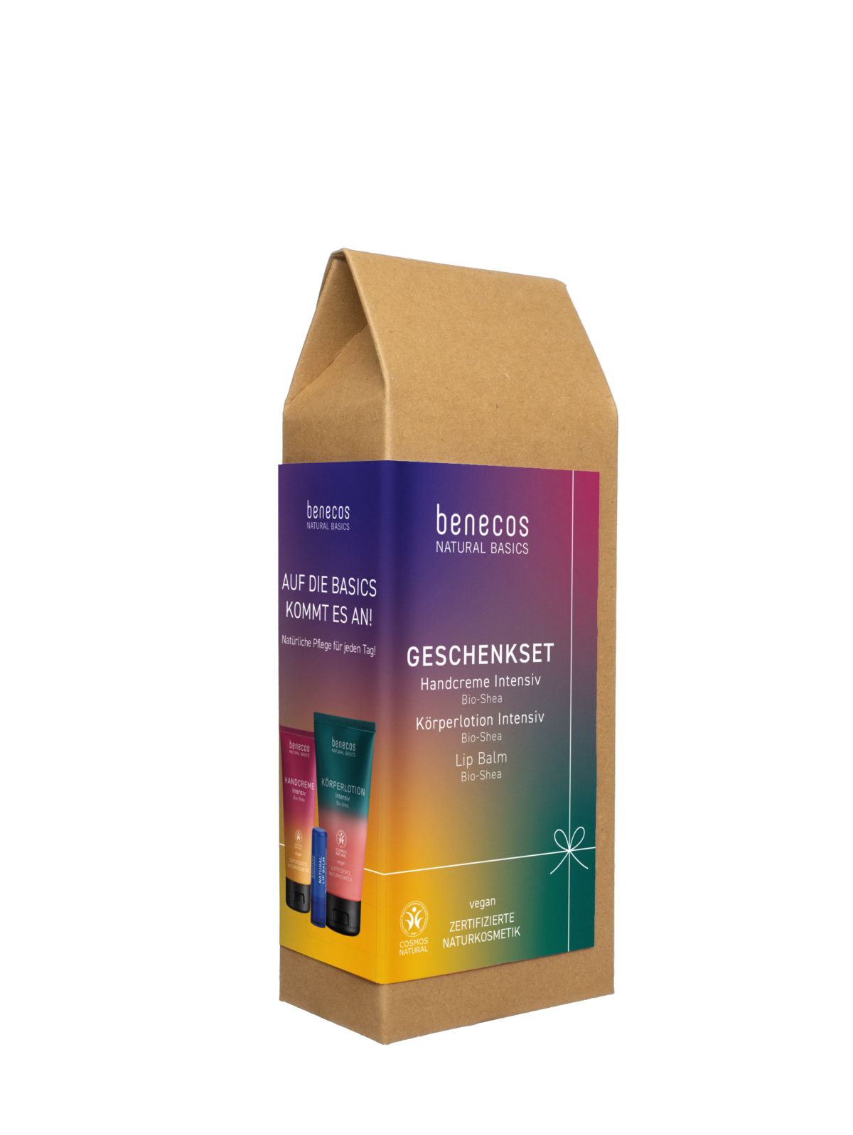 Auf die Basics kommt es an! Gute Pflege x 3: Körperlotion Bio-Sheabutter, Handcreme Bio-Sheabutter und Lip Balm im Geschenkset Intensiv.