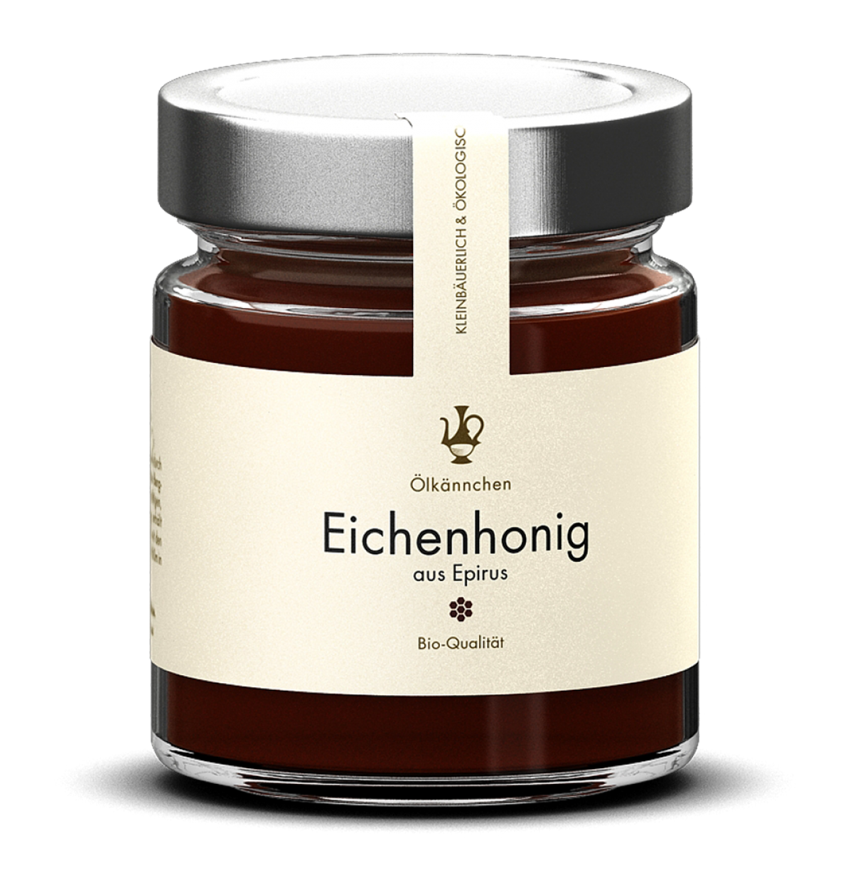 Bio Eichenhonig aus Epirus; aromatisch dicht und kräftig, in der Textur zähfließend. Jahrgangs- und erzeugerrein abgefüllt.