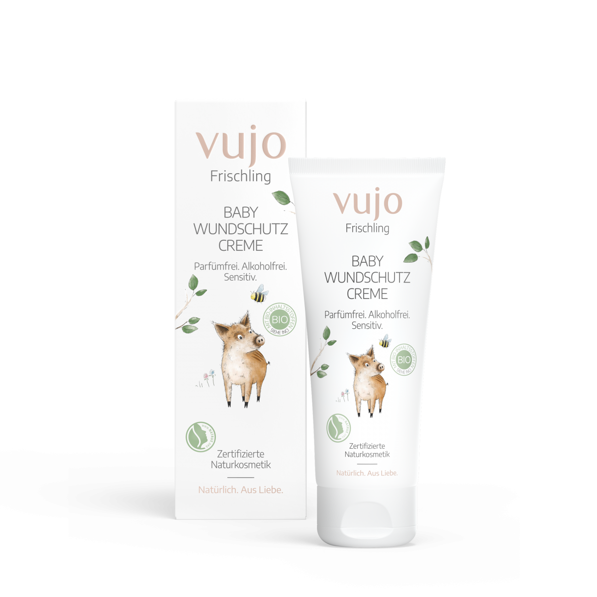 Der zarte Babypopo braucht ganz besonders viel Schutz. Ist die Haut des Babys gerötet oder gereizt, bedarf es sofort intensiver, natürlicher Pflege, die Reizungen lindert und Feuchtigkeit spendet. Die vujo Frischling Baby Wundschutzcreme mit hochwertigem Zink und natürlichen Bio-Ölen hilft schnell und beugt Wundsein vor. Sie hält Nässe ab, pflegt sanft raue Stellen und legt sich wie ein Schutzschild auf die empfindliche Haut.