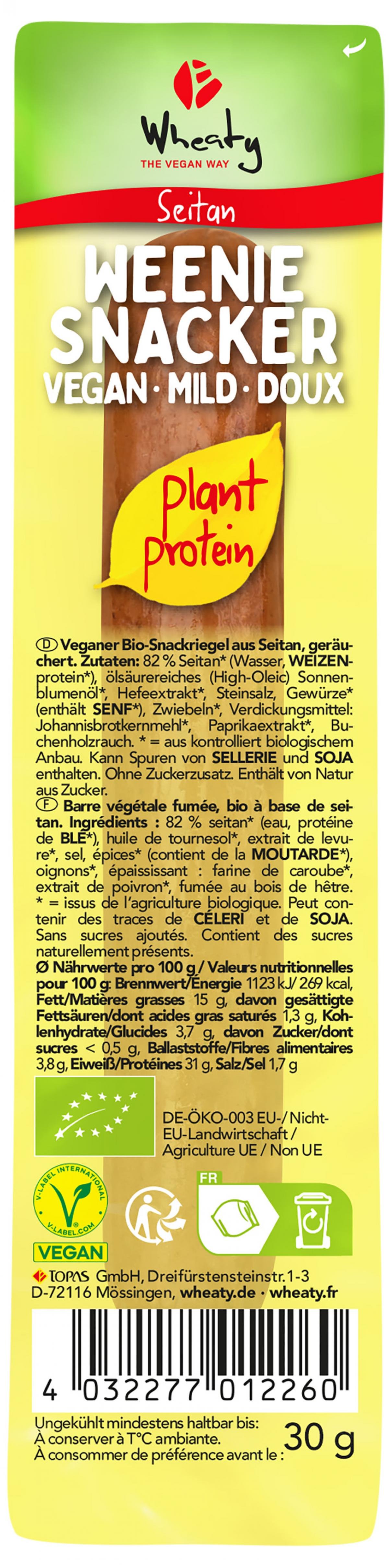 Die ungekühlt haltbaren, praktischen veganen Proteinriegel sind inzwischen weit über die vegane Szene hinaus bekannt und beliebt. Wheaty steht für hochwertige Bio-Erzeugnisse mit wenig Fett und viel gesundem pflanzlichen Eiweiß. Der "Weenie Snacker" ist eine Sorte, die nicht nur, aber besonders Kindern gefällt: Der Riegel schmeckt wie ein mildes Hot-Dog-Würstchen.