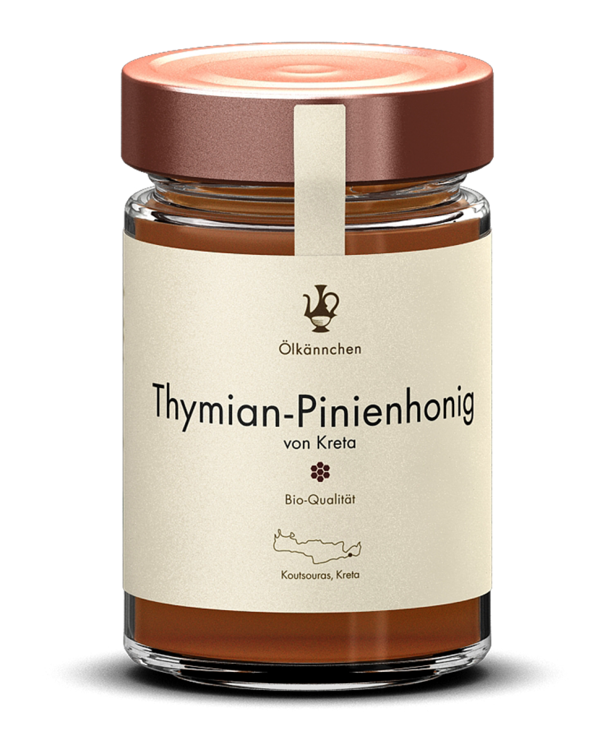 Bio Thymian-Pinienhonig ist die intensiv aromatische typische Cuvée der nacheinander stattfindenden Pinien- und Thymianhonigernte der Region Lassithi. Die kretische Honigspezialität wird jahrgangs- und erzeugerrein abgefüllt. Im rauen, trockenen Osten Kretas produziert Manolis Chaniotakis in einer kleinen Imkerei bei Koutsouras (Ierapetra) besonders intensive Honige. Manolis hatte schon während seines  Mathematikstudiums mit der Imkerei begonnen und schnell erkannt, dass sein Interesse und seine Berufung den Bienen gilt. Seine Bienenvölker, die er mit Hingabe hegt und pflegt, sammeln an unterschiedlichen Standorten, manche küstennah, manche im hügelig felsigen Hinterland. Die kretische Landschaft ist im Frühjahr und Sommer angefüllt von intensivem Duft nach Thymian und wilden Blumen. Die ätherisch intensiv duftenden Blüten spiegeln sich im aromatischen Geschmack der Honigspezialitäten wider. Raritäten wie Carobblütenhonig und Erika-, Salbei- und Thymianhonig schenken uns einzigartige Geschmackserlebnisse. Die geernteten Mengen sind gering, aber die Intensität und Dichte der Honige ist besonders. Die Honigspezialitäten werden gerne pur, auf Brot oder auch als aromatische Beigabe in Tee genossen.