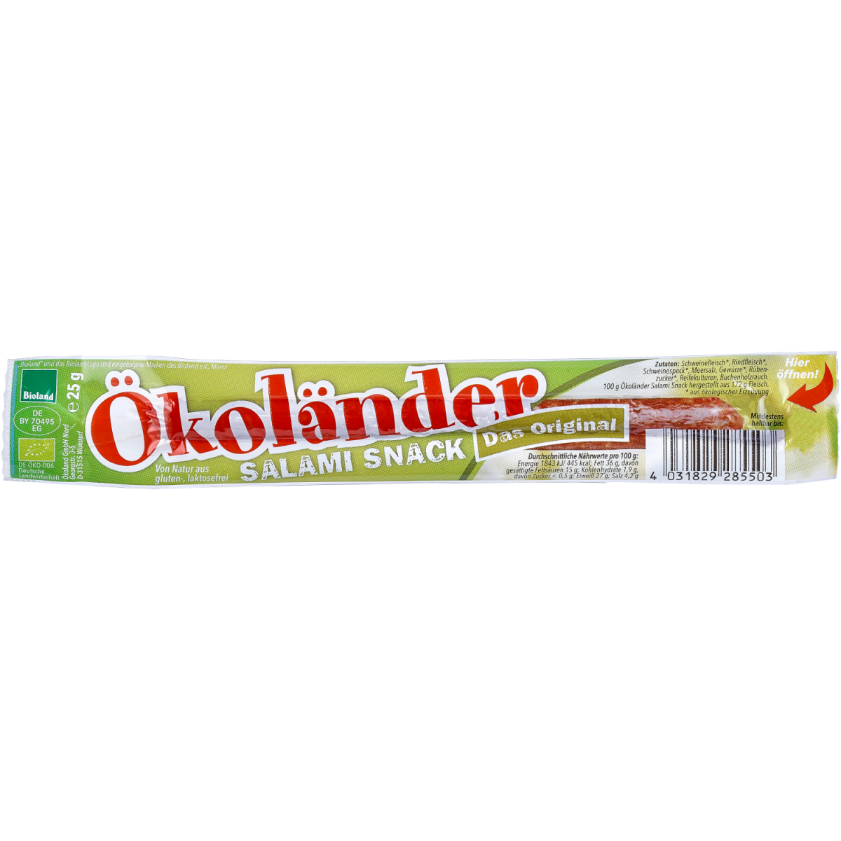 Die Salami Snacks von Ökoland werden aus hochwertigem Bio-Fleisch im Naturreifeverfahren hergestellt, d.h. sie werden ohne Zugabe von Hilfsmitteln einer Lufttrocknung unterzogen und anschließend geräuchert. Der Ökoländer original ist eine leckere Ergänzung zum Pausenbrot, für's Picknick oder schmeckt auch einfach mal zwischendurch.