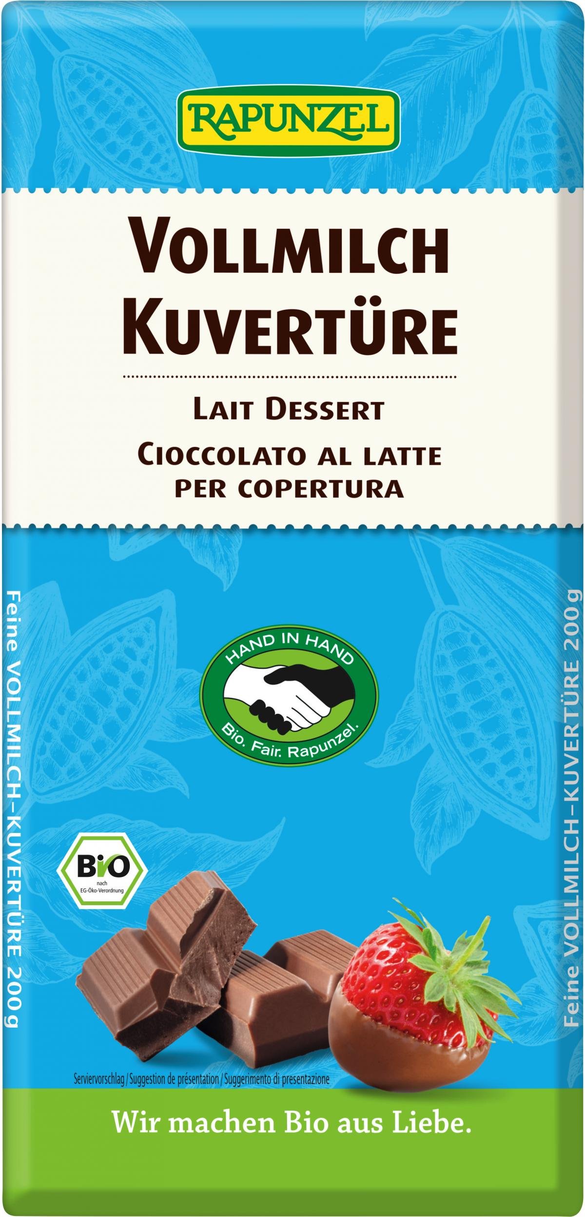 Was wären zarte Pralinen, süße Früchte oder feines Gebäck ohne diesen schmelzenden Überzug aus glänzender Schokolade? Wunderbar aromatischer Kakao und Vollmilch mit einem hauch Bourbon Vanille verfeinert Ihre Kuchen, Gebäcke und Pralinen. Die Kuvertüre wird aus fair gehandeltem Kakao und Zucker hergestellt und ist ein Produkt des Rapunzel HAND IN HAND-Sortiments.