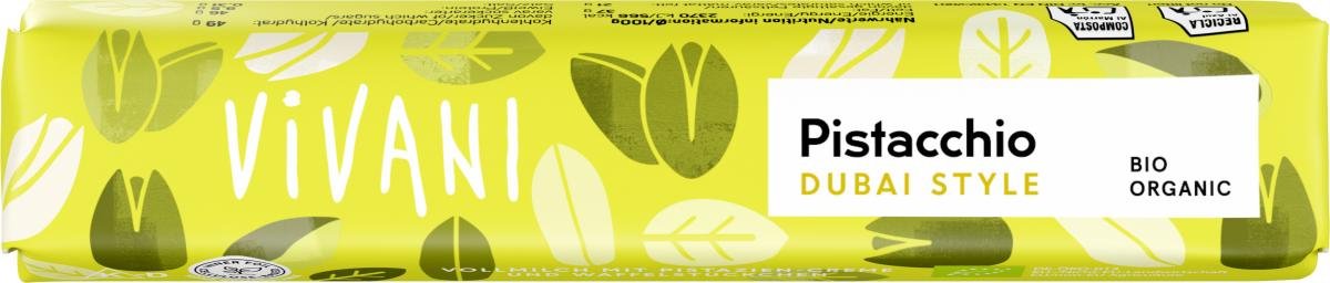 Bio Vollmilch Schokolade, gefüllt mit 37% Pistazien-Milchcreme und 2,8% Waffelstückchen