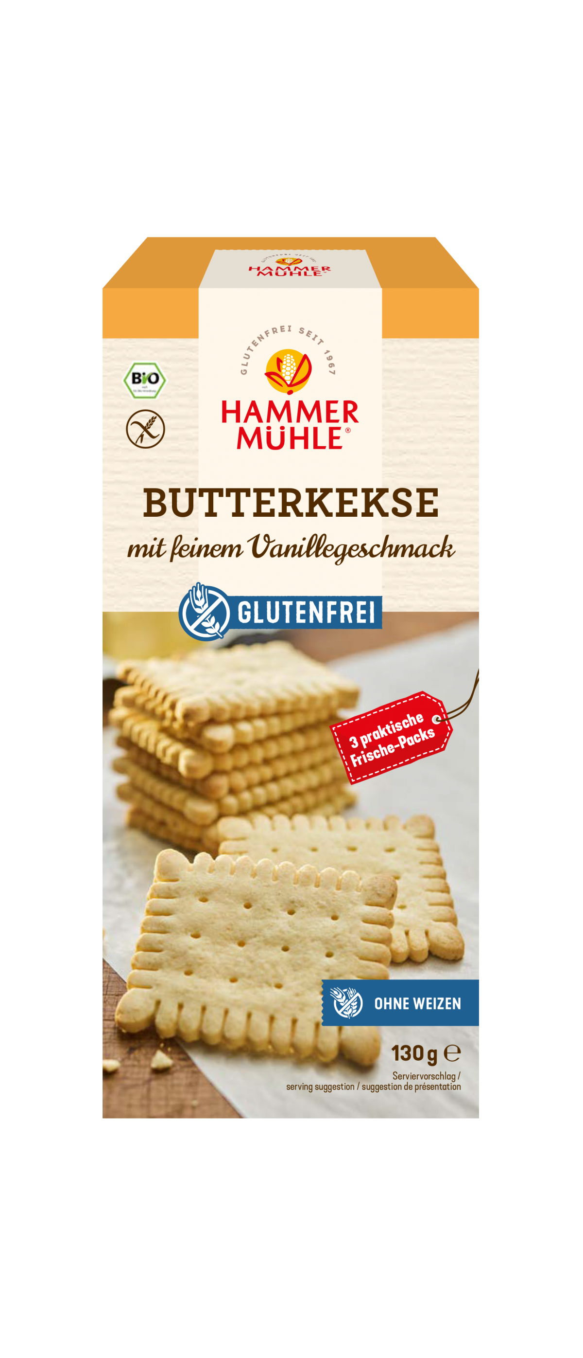 Der feine Butter- und Vanillegeschmack macht diese glutenfreien Kekse besonders köstlich. Einzeln verpackt sind sie ideal für unterwegs.