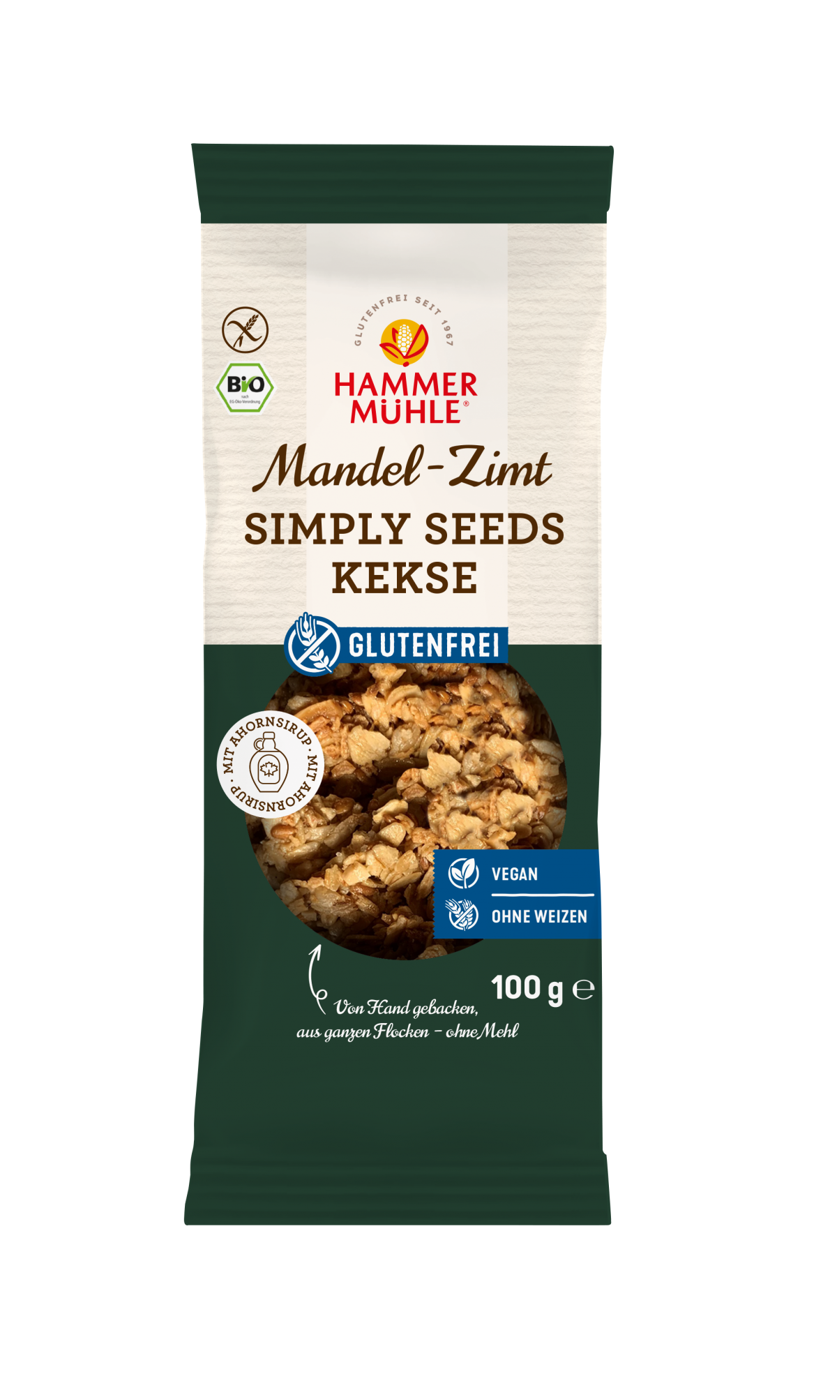 Unsere glutenfreien Simply Seeds Kekse Mandel-Zimt aus Haferflocken und Leinsamen vereinen wertvolle Zutaten mit unvergleichlich aromatischem Geschmack.